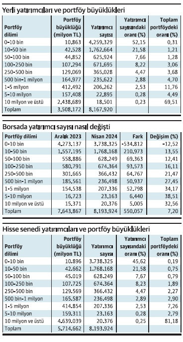 MKK nisan verilerine göre yerli ve yabancı yatırımcıların toplam portföyü yılsonuna göre yüzde 37,5 arttı 4.16 trilyon liradan 5.71 trilyon liraya yükseldi. Yatırımcı sayısı da yılsonunda 7 milyon 643 bin 867’den yüzde 7,2 artışla 8 milyon 193 bin 924’e çıktı. Portföy dilimleri bazında ise bu dönemde portföylerde en çok artış 10 milyon lira ve üstü portföye sahip olan yatırımcılarda gerçekleşti. 10 milyon lira ve üstü portföye sahip yerli ve yabancı yatırımcıların toplam portföyü Aralık 2023’e göre yüzde 39,83 artışla 3.31 trilyon liradan 4.64 trilyon liraya çıktı. Bu dönemde 10 milyon lira ve üstü portföye sahip yerli yatırımcıların portföyü yüzde 38,1 yükselerek 1.77 trilyon liradan 2.44 trilyon liraya ulaştı. Yabancı yatırımcıların ise yüzde 41,83 artışla 1.55 trilyon liradan 2.20 trilyon liraya yükseldi.