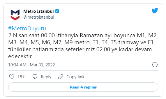 Metro İstanbul'un paylaşımı şu şekilde: "2 Nisan saat 00.00 itibarıyla Ramazan ayı boyunca M1, M2, M3, M4, M5, M6, M7, M9 metro, T1, T4, T5 tramvay ve F1 füniküler hatlarımızda seferlerimiz 02.00’ye kadar devam edecektir."