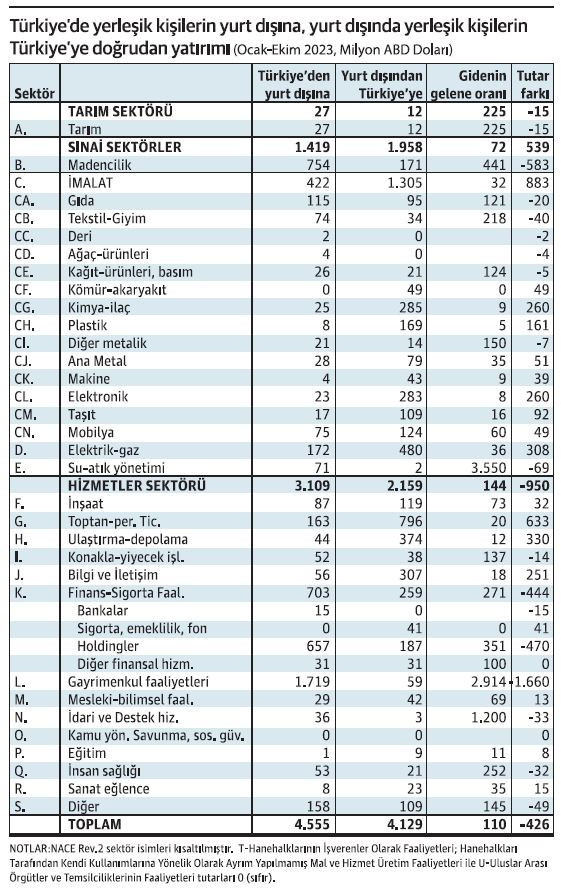 Netleştirmeler yapılmadan ve gayrimenkul hariç, mal ve hizmet üretimi yönünde ekonomik faaliyet bakımından Türkiye’ye yapılan doğrudan yatırımlar ocak-ekim 2023’te 4 milyar 129 milyon dolar oldu. Türkiye’den yurt dışına yapılan yatırım ise 4 milyar 555 milyon dolar olarak gerçekleşti. Bu şekilde bakıldığında Türkiye’den yurt dışına yapılan yatırım, gelen yatırımdan 426 milyon dolar daha fazla gerçekleşti. Geçen yıl aynı dönemde, Türkiye’ye gelen yatırım 1,7 milyar dolar daha fazlaydı.