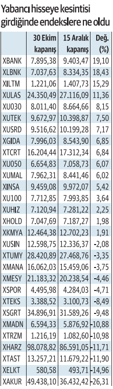 Türkiye ekonomisinde yaşanan değişimin izleri hisse senedi piyasalarında da gözle görülür hale geldi. Türkiye’nin 5 yıllık iflas risk primindeki düşüş, yabancı yatırımcıların yeniden TL varlıklara giriş yapması Borsa İstanbul endekslerinde ayrışma yaşattı. Yabancı yatırımcının TL varlıklara kesintisiz giriş yapmaya başladığı 30 Ekim’den 15 Aralık kapanışına kadar bankacılık endeksi yüzde 19,1 yükseldi. Son yılların gözdesi halka arz endeksi ise aynı dönemde yüzde 11,7, BİST100 dışı hisselerin oluşturduğu BİSTÜMY endeksi ise yüzde 3,35 kayıp yaşadı. Oysa ki 30 Ekim-15 Aralık arasında 12 yeni halka arz şirketi borsaya işlem görmeye de başladı. Yabancı yatırımcı ise hisseye 30 Ekim ile başlayan haftadan 8 Aralık sonuna kadar yaklaşık 1.4 milyar dolar giriş yaptı